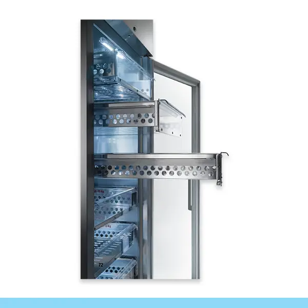 Armário refrigerado médico em aço inoxidável, monobloco, baixa temperatura, com unidade incorporada.