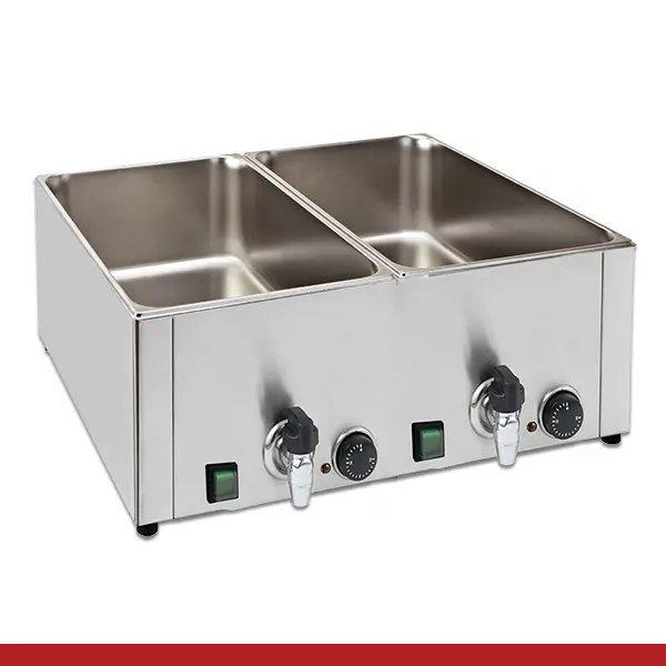 • Estrutura em aço inox • Modelo com torneira • Equipado com proteção em antirefluxo • Termostato com temperatura regulável até aos 90ºC • Interruptor on/off •Containers não incluídos