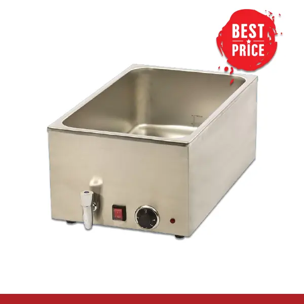 • Estrutura em aço inox • Modelo com torneira • Equipado com proteção em antirefluxo • Termostato com temperatura regulável até aos 90ºC • Interruptor on/off •Containers não incluídos