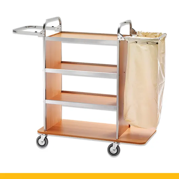 Carro com estrutura em aço-inox, com saco em tecido hidrófugo, prateleiras laminadas e rodas direcionais.