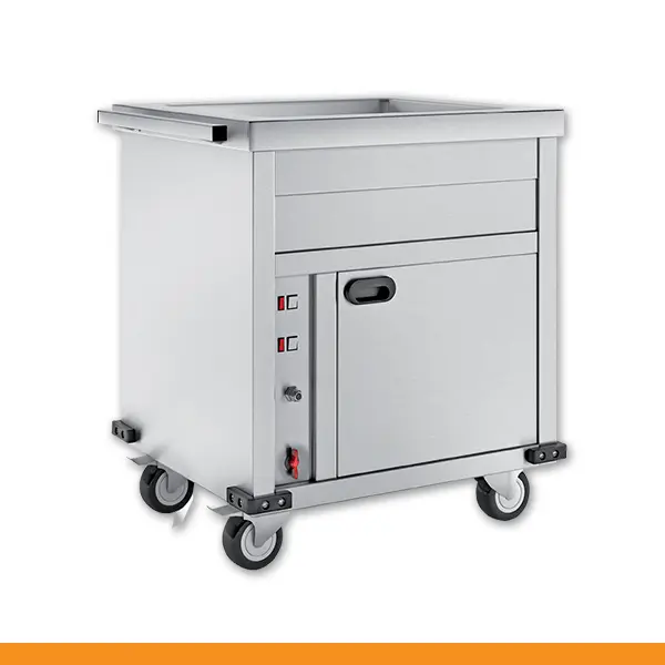 Capacidade: 4 GN 1/1 150 Dimensões: 700L x 800P x 940A mm Potência: 1500 W Voltagem: 230 V Rodas: 4 (2 com travão)