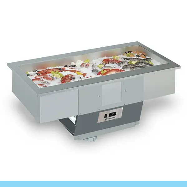 Características gerais ▪Medidas: 1422L x 750P x 605A mm | Temperatura: Gelo | Plano refrigerante: 1290L x 580P x 110A mm ▪ Cuba de aço inoxidável AISI 316 resistente ao sal