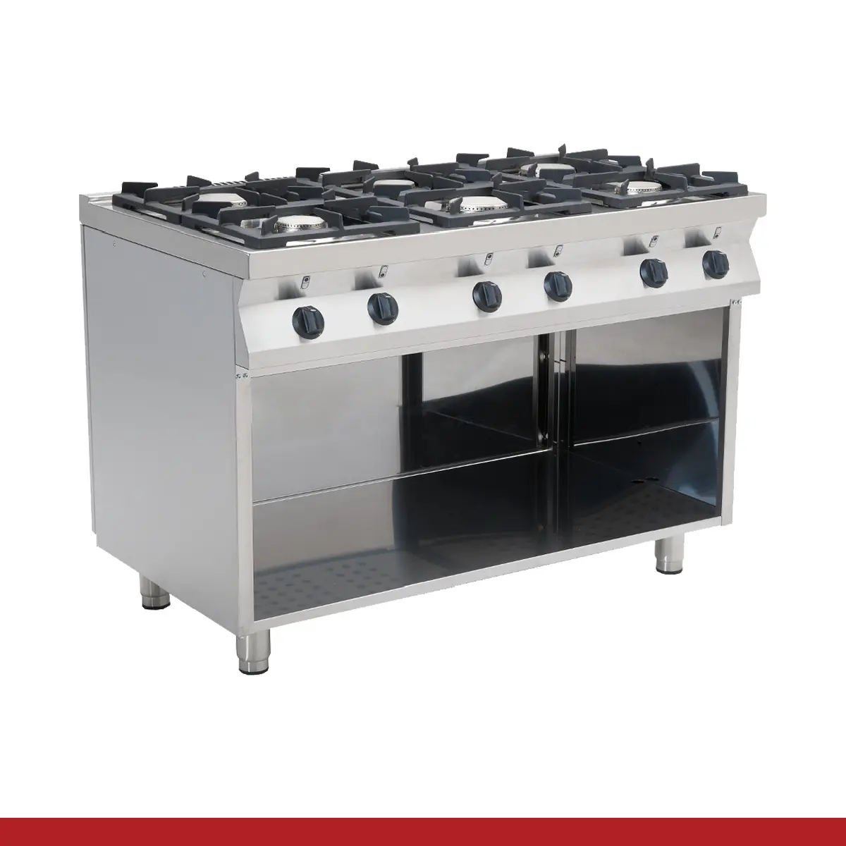 Fogão a gás de 6 queimadores sem forno com base aberta. Construído e certificado com marca CE.
