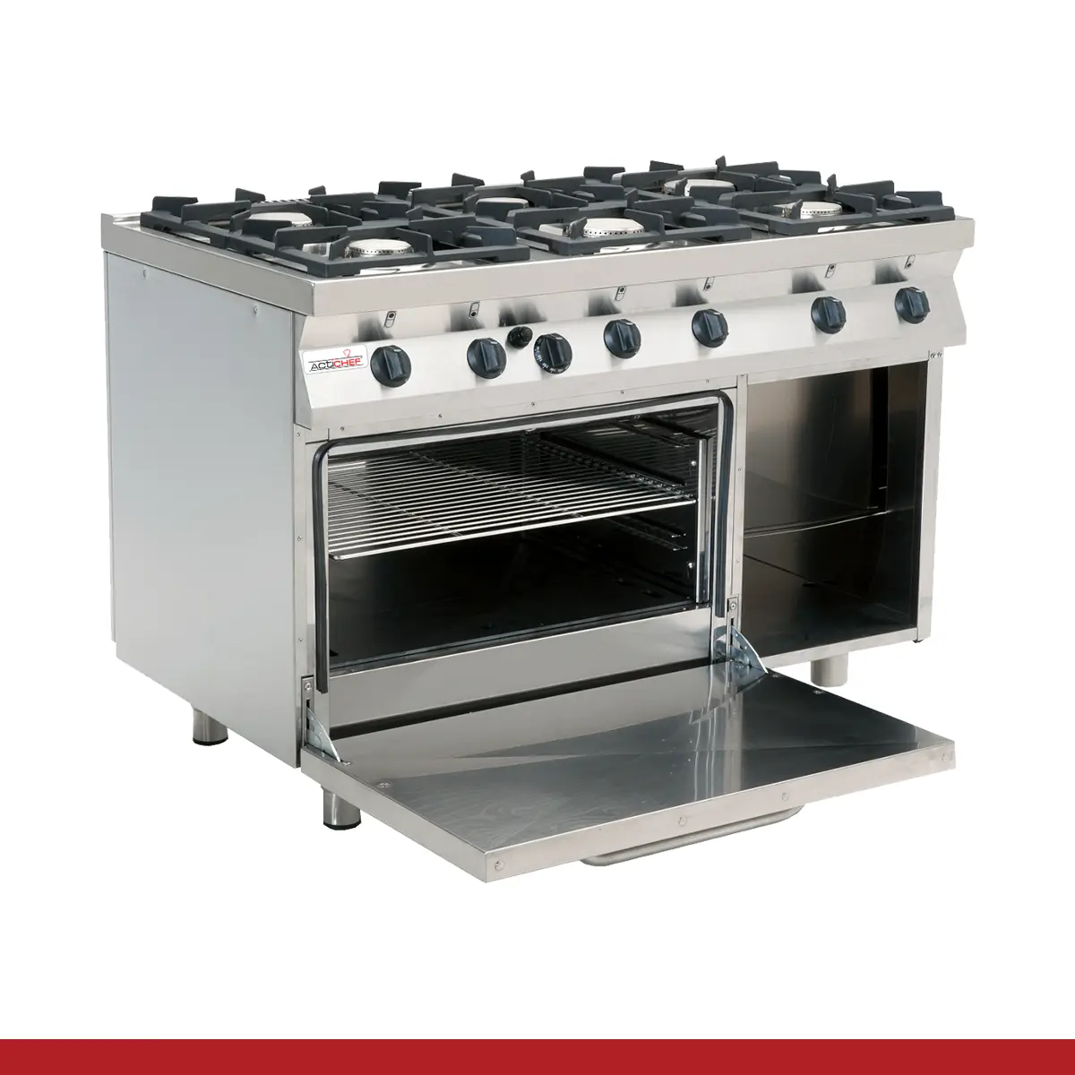 Fogão 6 queimadores com forno a gás em base aberta. Construído e certificado com marca CE.