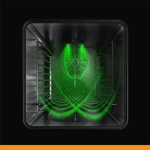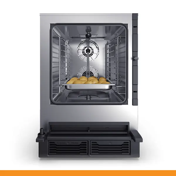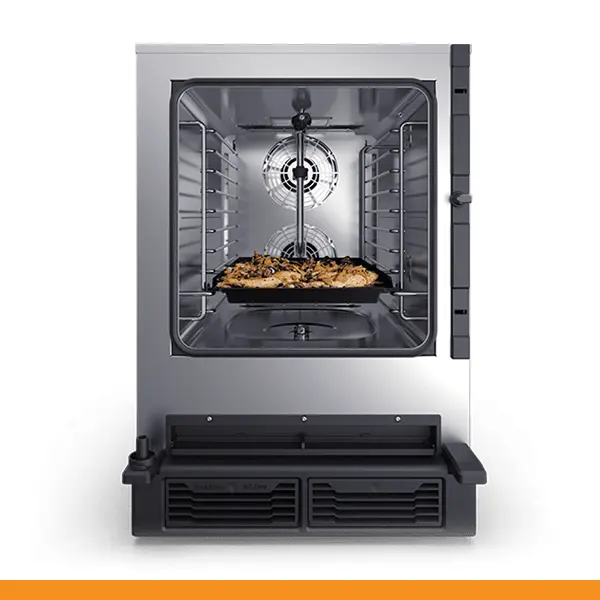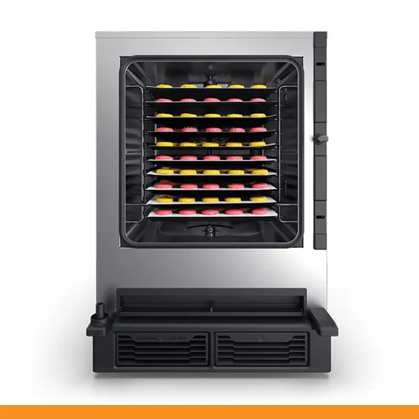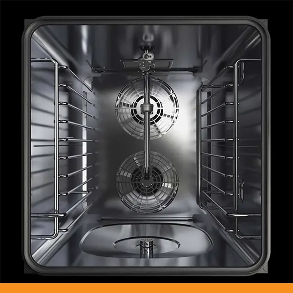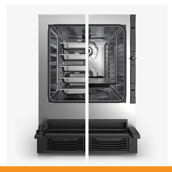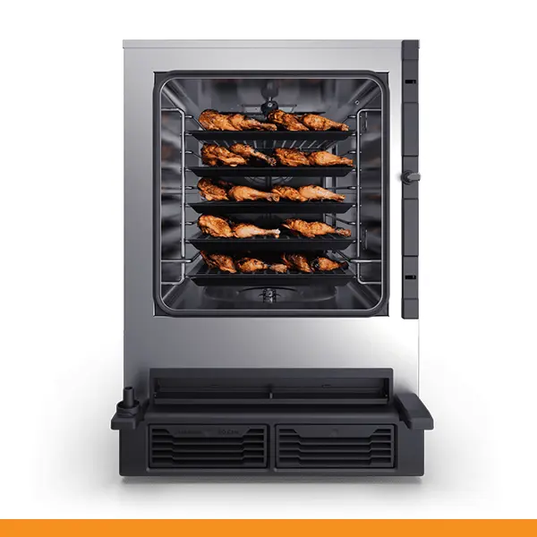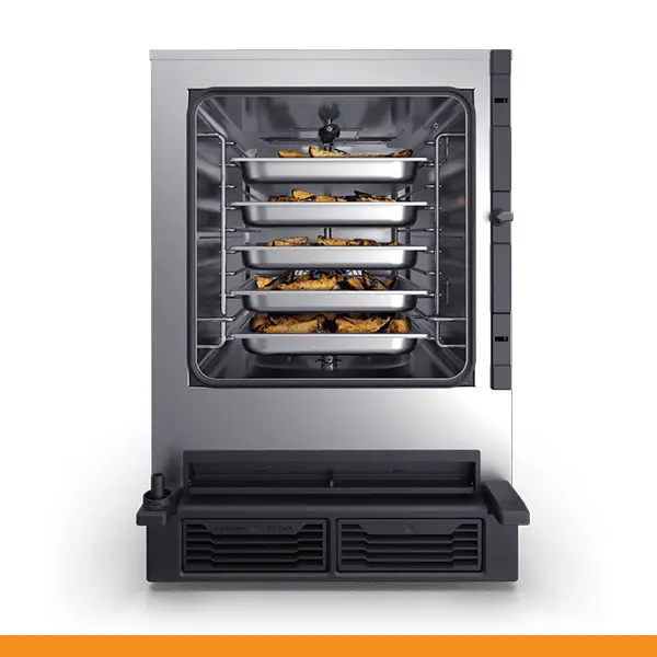 A câmara de cozimento SPEED-X tem uma capacidade de 10 tabuleiros GN 2/3 com distância de 35 mm ou 5 tabuleiros GN 2/3 com distância de 70 mm para o modo combi e uma posição dedicada ao tabuleiro SPEED.Plate para obter até 4 cozimentos acelerados simultaneamente no modo velocidade.