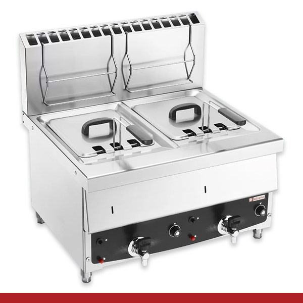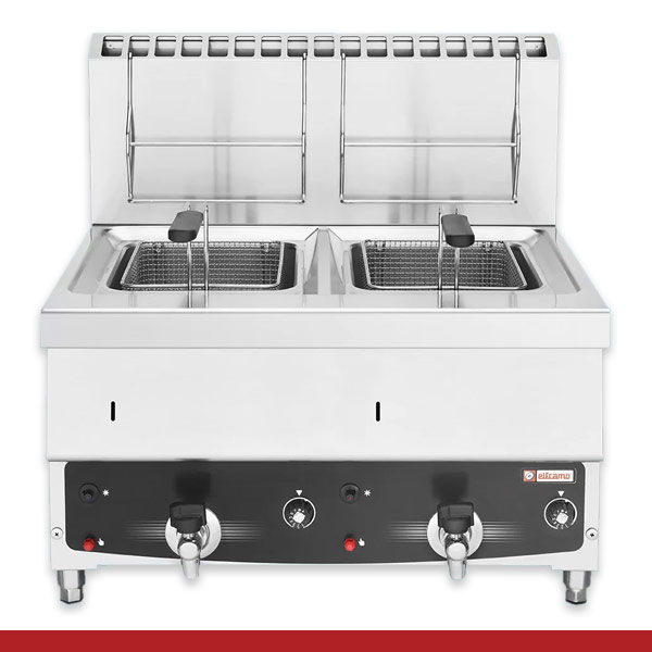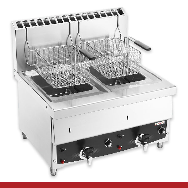 • Cuba modelada sem soldaduras e tubos queimadores • Temperatura do óleo regulável por termostato • Válvula de gás mecânica com termostato • Termostato de segurança • Pés ajustáveis