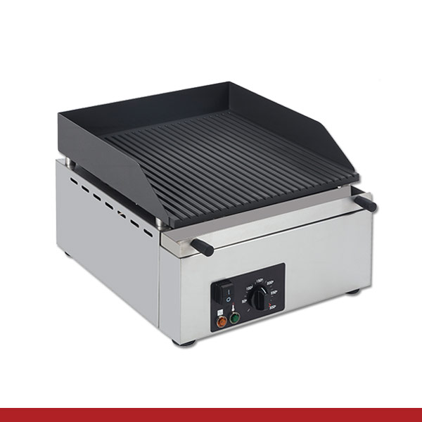 • Placas para grelhar elétricas lisas e nervuradas com revestimento cerâmico antiaderente, para fácil limpeza e manutenção
