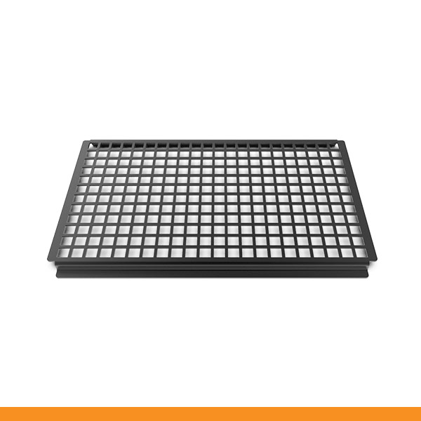 Tabuleiro em alumínio antiaderente para grelhar. Não é necessário o pré-aquecimento do tabuleiro.