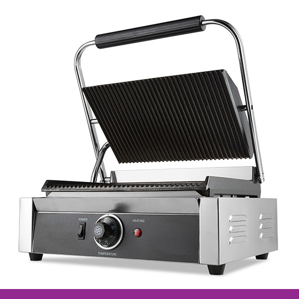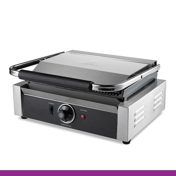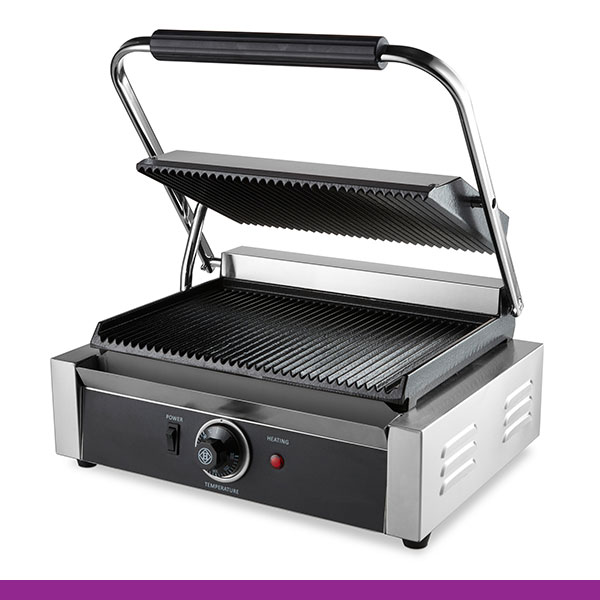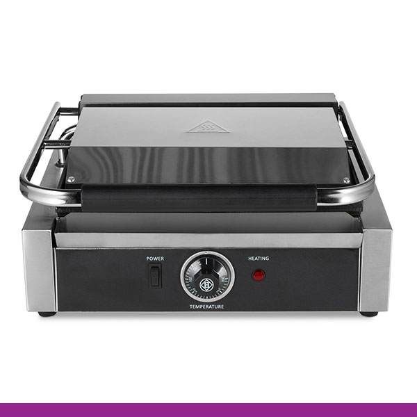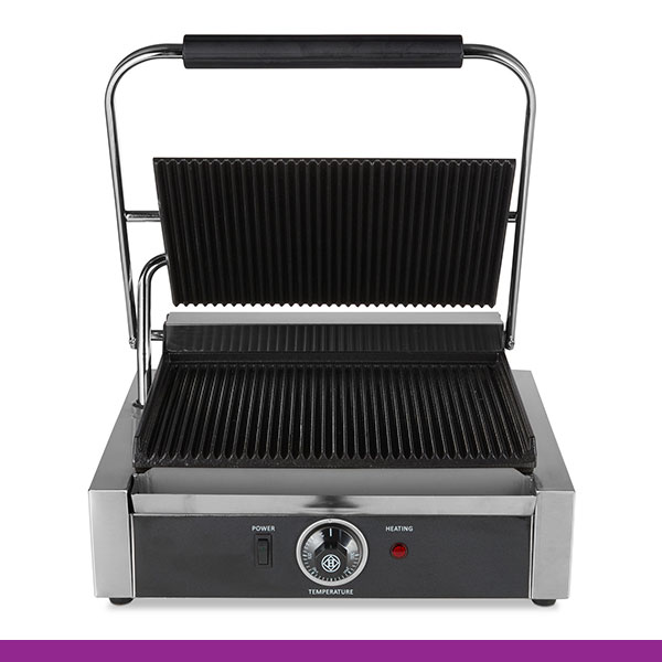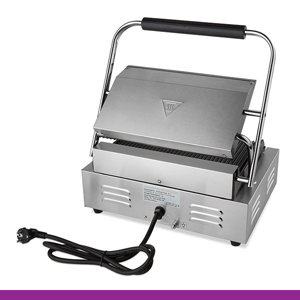 Grelhadores de prensa profissionais com grelhas pesadas de ferro fundido. Inclui uma escova de limpeza, que facilita e ajuda bastante, a manter o grelhador limpo.