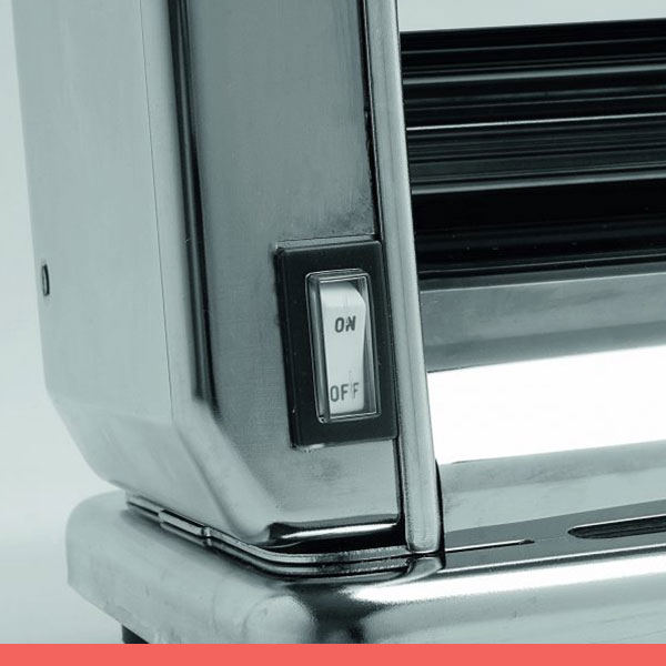 Laminador profissional em aço inox AISI 304 reforçado, com botão regulador com indicador numerado para 10 espessuras de folha passada. Massa para lasanha, esparguete, entre outras