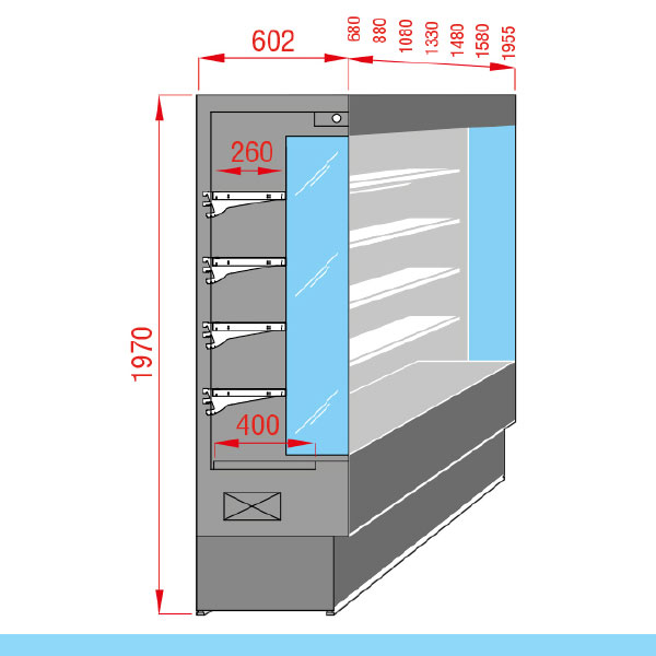 Modelos neutros e modelos com unidade frigorifica interna, com diferentes medidas (largura): 680, 880, 1080, 1330, 1480, 1580 e 1955 mm